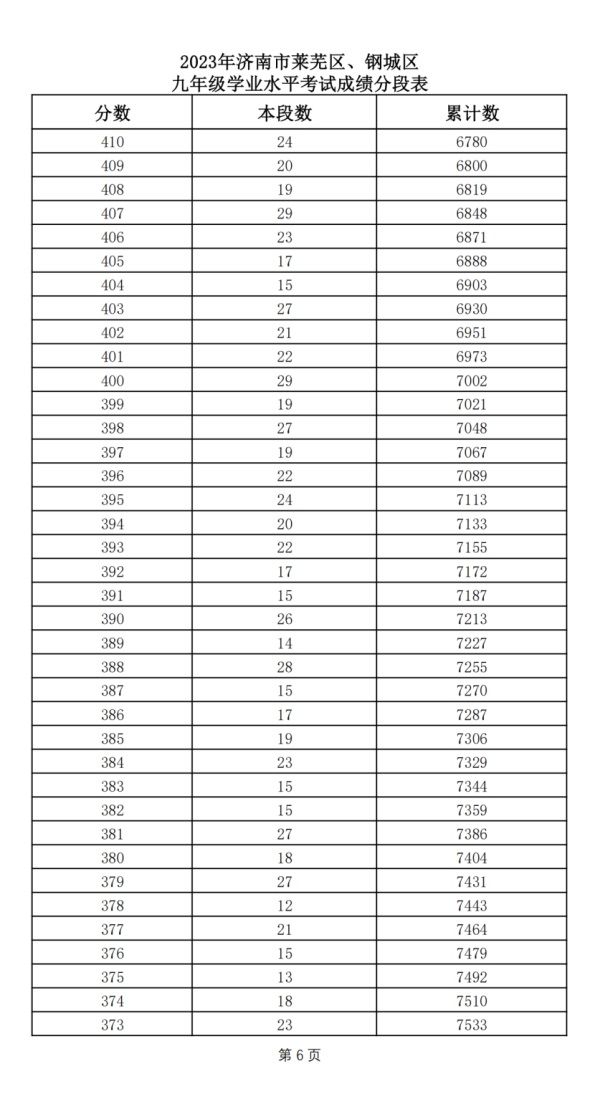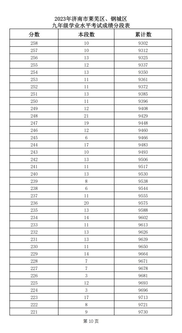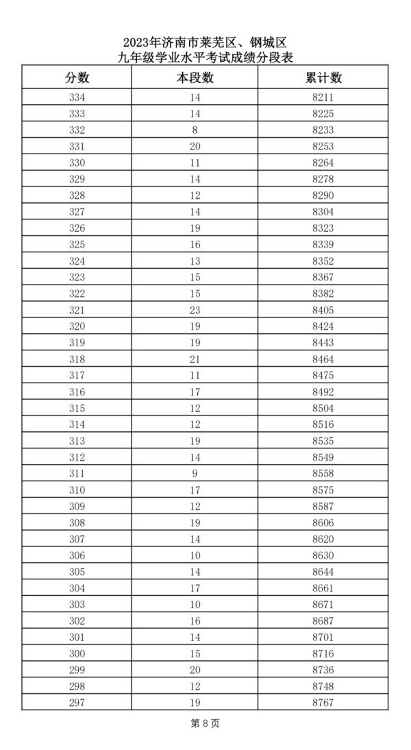 2023年济南市莱芜区、钢城区 九年级学业水平考试成绩分段表